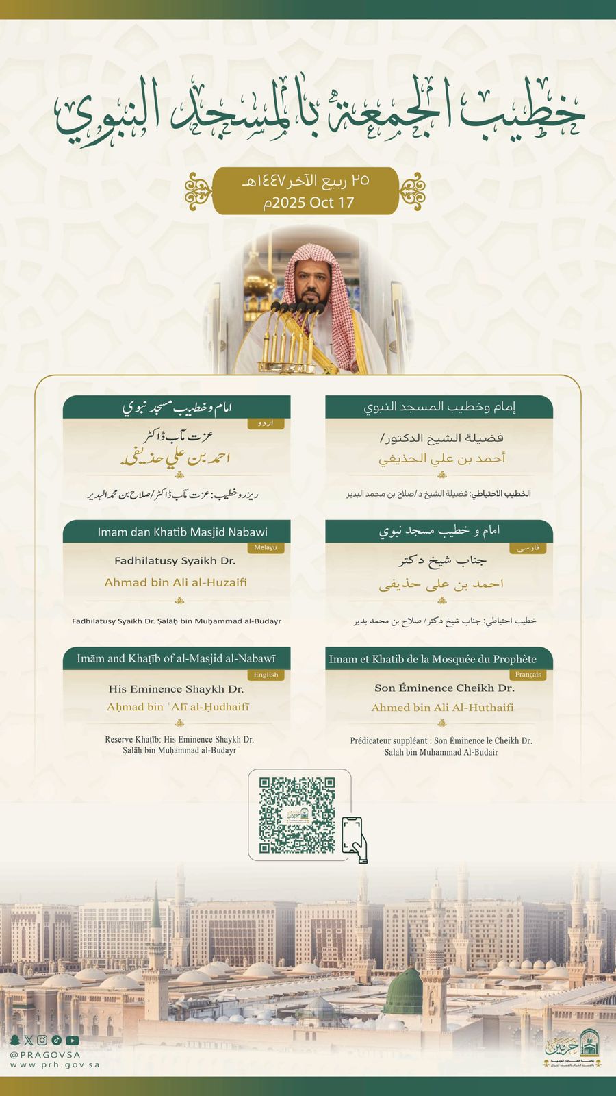 فيما يخطب ويؤم المصلين في المسجد النبوي فضيلة الشيخ الدكتور أحمد الحذيفي
