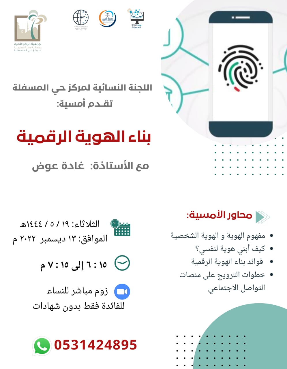 تقدم اللجنة النسائية لمركز لمركز حي المسفلة التابع لجمعية مراكز الاحياء بمكة المكرمة امسية عن بعد بعنوان بناء الهوية الرقمية ، مع الأستاذة:غادة عوض