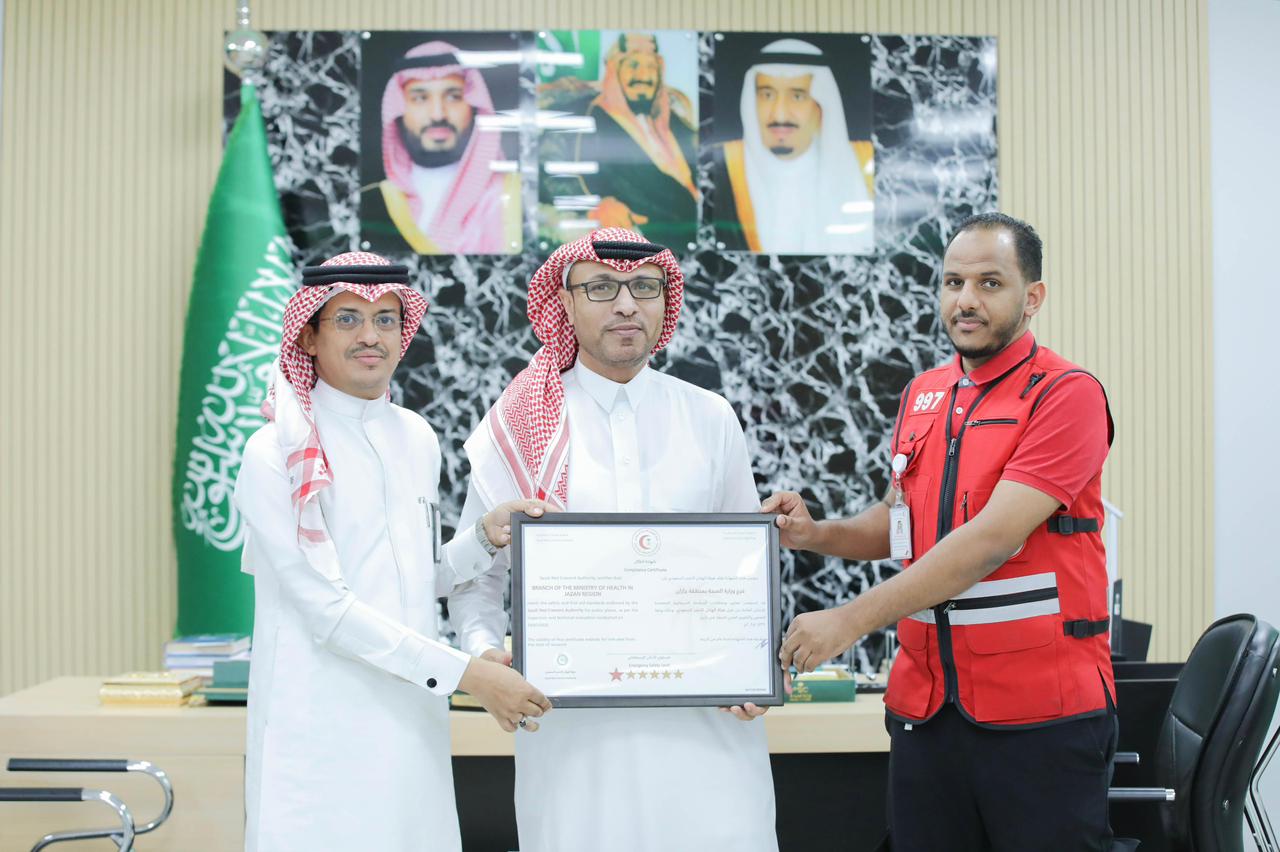 “الهلال الأحمر بجازان يسلّم شهادة الامتثال للسلامة الإسعافية لفرع وزارة الصحة بالمنطقة”