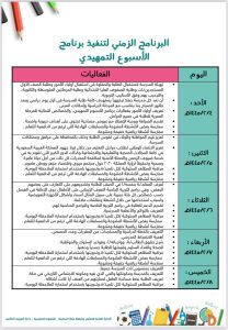 حيث يهدف برنامج الاسبوع التمهيدي إلى تبسيط الواقع المدرسي لجميع الطلبة وفق برنامج تربوي تدريجي مشوق ومحبب للنفس يساعد الطلاب المستجدين على الانتقال من محيط الأسرة الذي ألفوه إلى محيط المدرسة الأكثر رحابة وسعة، لاسيما إلى دوره الفاعل في مساعدتهم على التكيف نفسياً واجتماعياً مع المجتمع المدرسي الجديد وذلك من خلال إعداد فعاليات محفزة وبرامج جاذبة للبدء والانتظام الدراسي.