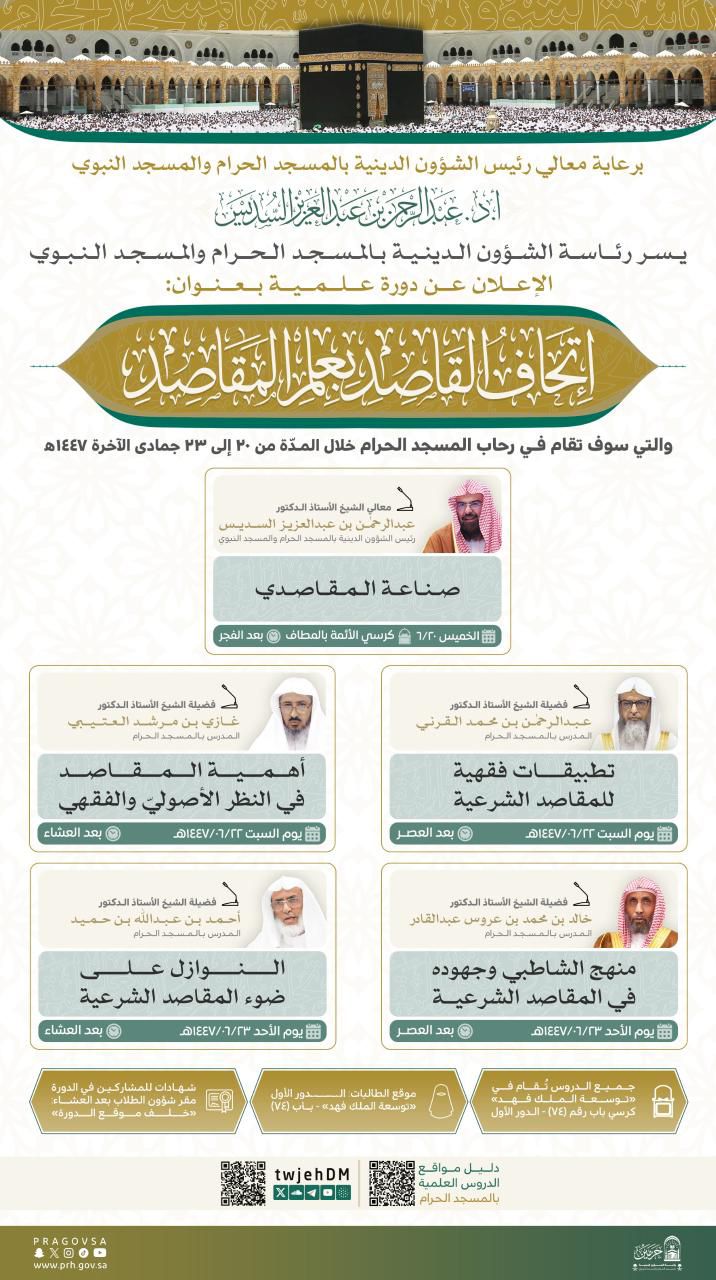 أوضحت رئاسة الشؤون الدينية بالمسجد الحرام والمسجد النبوي عن إطلاق دورة علمية بعنوان “إتحاف القاصد بعلم المقاصد”، وذلك ضمن برامجها العلمية والتوعوية الموجهة لقاصدي المسجد الحرام، بهدف تعزيز المعرفة الشرعية وتيسير فهم المناسك وفق منهجية علمية راسخة.