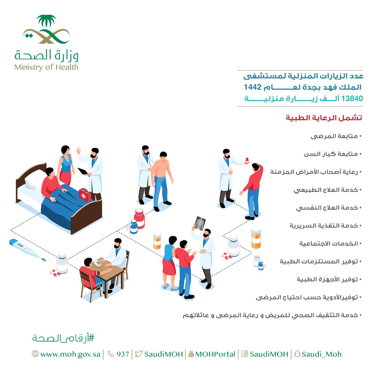 من جهة أخرى بلغ عدد الزيارات المنزلية لمستشفى الملك فهد بجدة لعام ١٤٤٢ حوالي ١٣٨٤٠ ألف زيارة منزلية ، حيث أن الخدمات التي تقدمها الرعاية المنزلية بالمستشفى كثيرة و عديدة ولله الحمد ، و تشمل الرعاية الطبية و التمريضية الشاملة و كذلك متابعة المرضى و كبار السن ، و رعاية أصحاب الأمراض المزمنة بالإضافة إلى توفير خدمة العلاج الطبيعي و العلاج النفسي و التغذية السريرية و الخدمات الاجتماعية ، و كذلك تقدم خدمة التثقيف الصحي للمريض و رعاية المرضى و عائلاتهم ، و يشار أيضاً أن من ضمن الخدمات التي تقدم من الرعاية المنزلية توفير المستلزمات الطبية و الأجهزة الطبية و الأدوية حسب احتياج المرضى ، و تتم هذه الخدمات و تطبق مع مراعاة المعايير الاحترازية لمكافحة العدوى ، و ذلك خلال الزيارات الميدانية للفرق الطبية و أيضاً الاحترازات الخاصة بفيروس كورونا ، و هذه الخدمات الطبية تقدمها وزارة الصحة من خلال المستشفيات بالمحافظات و المدن للمرضى الذين لا يستطيعون الوصول للمنشآت الصحية في أماكن اقامتهم .