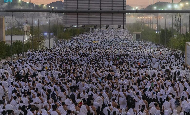 مشهد النفرة والجموع المليونية تسلك مسارات المشاة التي اكتست ببياض الإحرامات في ثالث محطة في رحلة الحج .