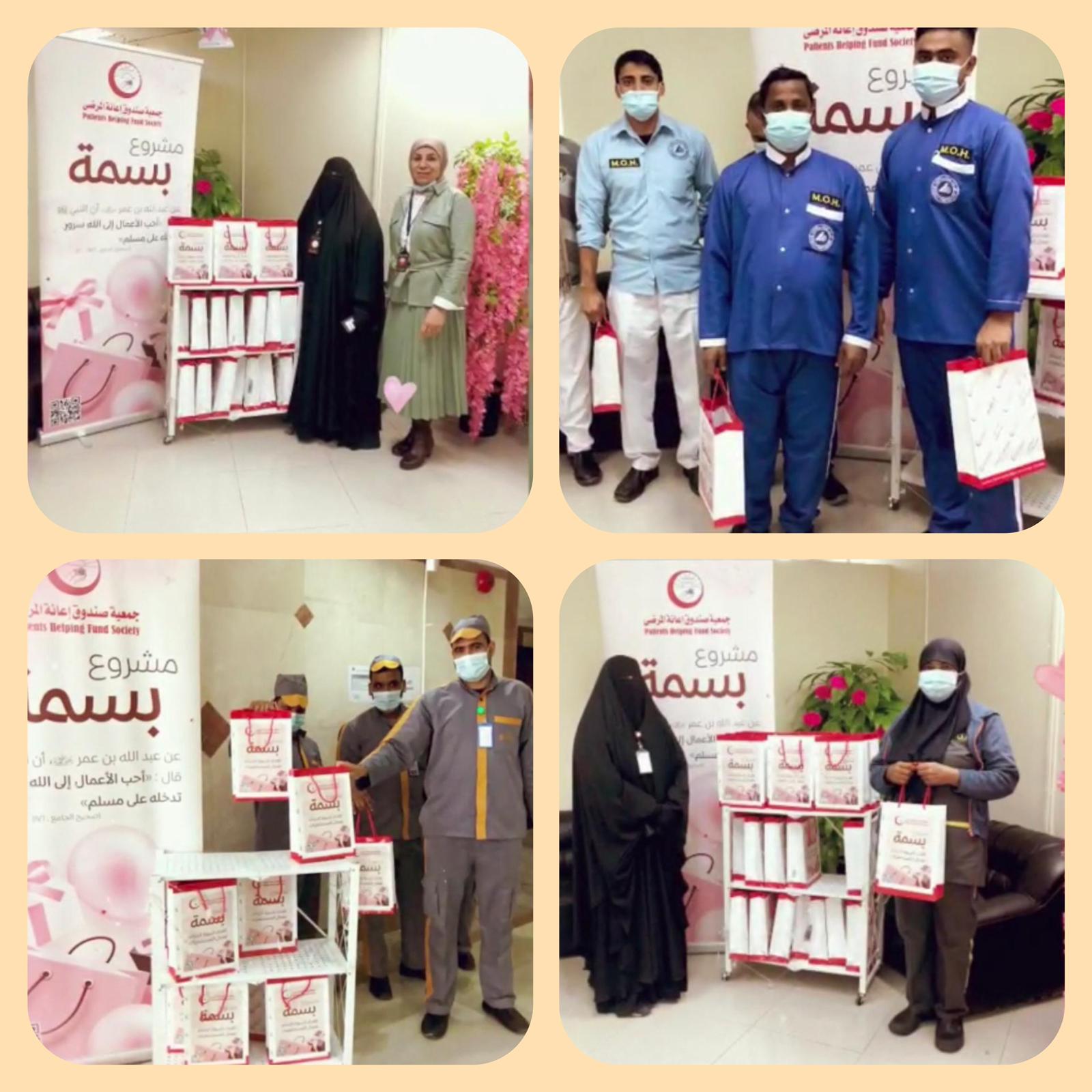 في اطار مشروعها الانساني الخيري السنوي قامت جمعية صندوق إعانة المرضى ممثلة بإدارة التوعية والإرشاد- قسم الواعظات بتوزيع كسوة الشتاء خلال شهر ديسمبر ٢٠٢١ م على العمال في المستشفيات ضمن مشروعها “بسمة” .