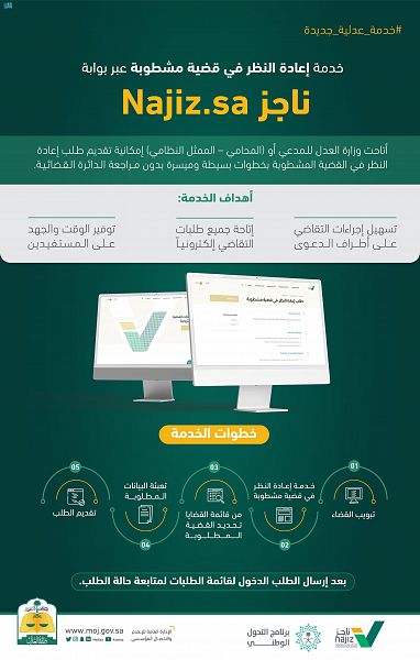 أطلقت وزارة العدل خدمة جديدة تسمح للمحامي والوكيل والممثل النظامي بتقديم طلب إعادة النظر في قضية مشطوبة عبر بوابة ناجز najiz.sa، وبشكل إلكتروني كامل دون الحاجة لمراجعة المحكمة.