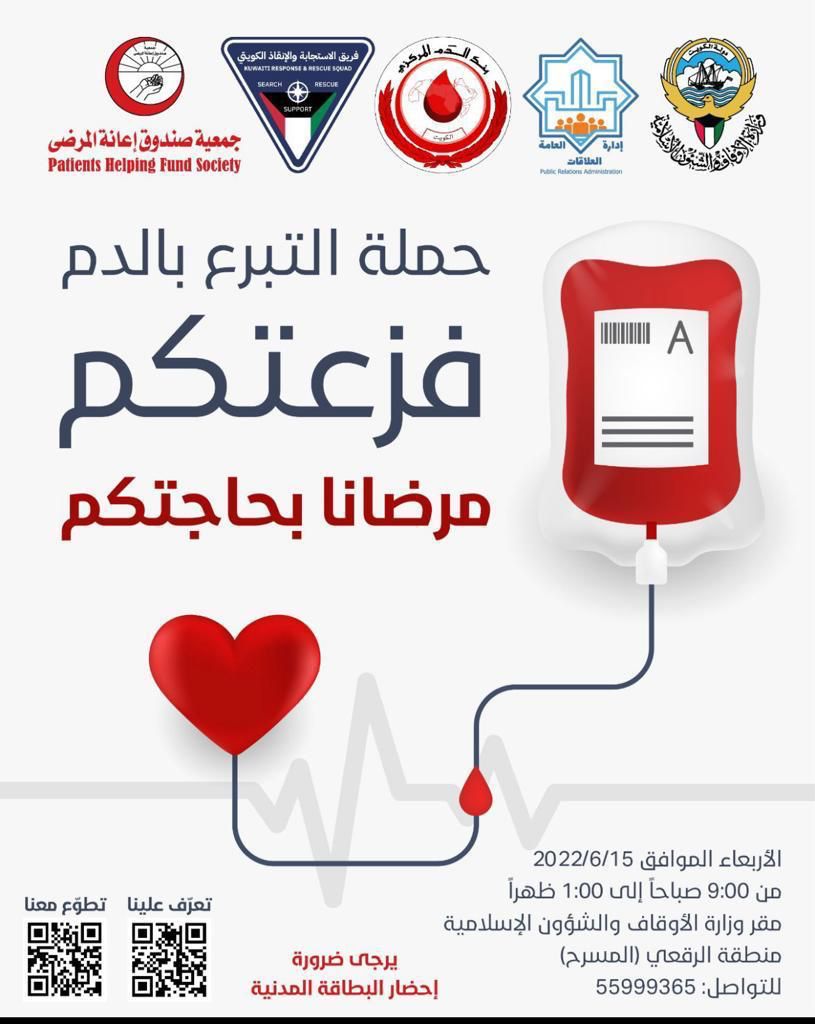 بالتعاون مع بنك الدم المركزي وإدارة العلاقات العامة بوزارة الاوقاف والشئون الاسلامية.