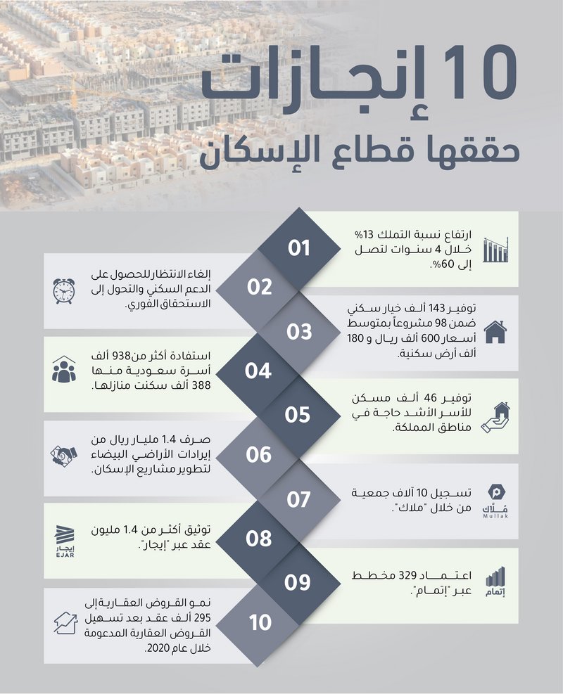 ويأتي ضمن إنجازات القطاع، تحقيق الهدف الاستراتيجي المتمثل في الوصول إلى 60% من نسبة التملك في 2020، بزيادة 13% مقارنة بنسبة 47% قبل إطلاق البرنامج في 2016، وإلغاء مفهوم الانتظار للحصول على الدعم السكني من خلال استحداث منصة إلكترونية توفر الاستحقاق الفوري للمواطنين، وتقديم أكثر من 143 ألف خيار سكني لوحدات تحت الإنشاء (شقق وفلل وتاون هاوس) في 98 مشروعًا بأسعار تنافسية ميسرة يصل متوسطها إلى 600 ألف ريال، و180 ألف أرض سكنية ضمن 223 مخططًا، علاوة على استفادة أكثر من 938 ألف أسرة سعودية منها أكثر من 388 آلاف أسرة سكنت منازلها.