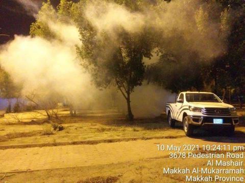 ويباشر تطبيق مهام الإصحاح البيئي وتهيئة الأجواء بالمشاعر المقدسة 54 عاملاً من المشرفين والفنيين عبر 21 سيارة و 27 جهازاً يدوياً، وبلغ عدد البؤر المستكشفة 123 بؤرة إيجابية و292 سلبية.