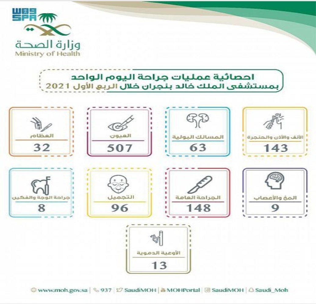 أجرى مستشفى الملك خالد بنجران 1029 عملية في قسم جراحة اليوم الواحد، وذلك خلال الربع الأول من العام الجاري 2021م.