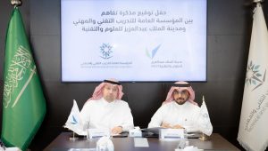 وقعت المؤسسة العامة للتدريب التقني والمهني، ومدينة الملك عبد العزيز للعلوم والتقنية، اتفاقية تعاون لإنشاء معهد للشراكات الاستراتيجية لتدريب وتأهيل الكوادر الوطنية.