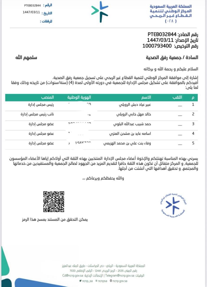 صدرت موافقة المركز الوطني لتنمية القطاع غير الربحي على تسجيل جمعية رفق الصحية بطريف وتشكيل مجلس إدارتها في دورته الأولى لمدة ٤ سنوات من تاريخه وفقاً لمايلي