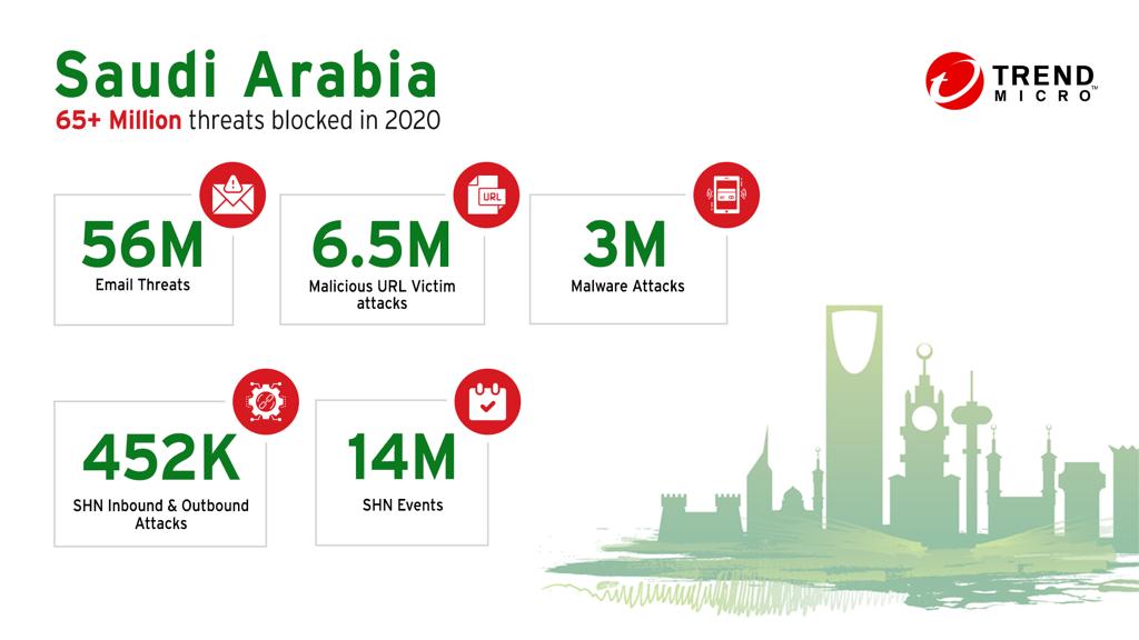 وعلى صعيد المملكة العربية السعودية، أسهمت حلول تريند مايكرو المبتكرة في كشف وإيقاف أكثر من 56 مليون تهديد عبر البريد الإلكتروني، ومنعت حدوث أكثر من 6.5 مليون هجمة Victim باستخدام الروابط الضارة ، فضلاً عن ما يقارب حوالي 17,000 هجمة عبر الروابط المضيفة. كما أسهمت تريند مايكرو في تحديد وإيقاف أكثر من 3 ملايين هجمة عبر البرامج الضارة ، بالإضافة إلى إيقاف ما يقارب 2000 هجمة عبر البرامج الضارة التي استهدفت مواقع بنكية ومصرفية.