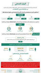 وأشارت إلى أنه تم ضبط 107 متورطين في نقل وإيواء وتشغيل مخالفي أنظمة الإقامة والعمل وأمن الحدود والتستر عليهم، وبلغ إجمالي من يتم إخضاعهم حاليًا لإجراءات تنفيذ الأنظمة 86626 وافداً مخالفًا، منهم 77657 رجلاً، و8969 امرأة.