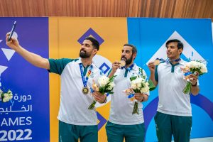 وحقق لاعبو المنتخب السعودي للرماية، عطا الله العنزي وسفر الدوسري ومحمد العمري، الميدالية البرونزية لمسابقة رماية مسدس 10م هوائي للفرق، في اليوم قبل الأخير لمسابقة الرماية في الدورة.