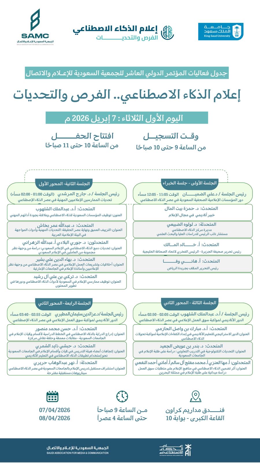 تنطلق اليوم الثلاثاء ٧ ابريل ٢٠٢٦ م فعاليات المؤتمر الدولي العاشر للجمعية السعودية للإعلام والاتصال بعنوان “إعلام الذكاء الاصطناعي.. الفرص والتحديات” في القاعة الكبرى بفندق مداريم كراون بوابة ١٠ شرق الرياض، وذلك برعاية رئيس جامعة الملك سعود المكلف الأستاذ الدكتور علي بن محمد مسملي.