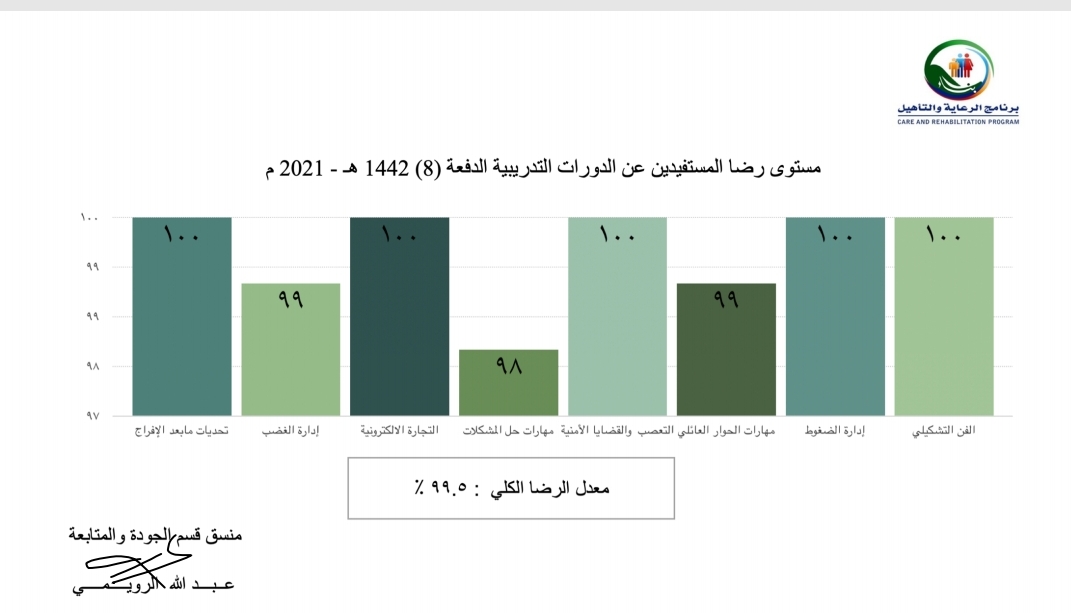 وفي نهاية الدورة عبر المستفيدين عن مدى استفادتهم من الدورات والورش التدريبية وتطبيقها في حياتهم الاجتماعية والعملية وقد حققت الدورات التأهيلية المقدمة للمستفيدين من برنامج الرعاية والتأهيل (بناء) طيلة هذا الاسبوع نسبة رضا بلغ (99.5 %) وفي ختام اليوم التدريبي تم توزيع شهادات التكريم لمستفيدين برنامج الرعاية والتأهيل (بناء).