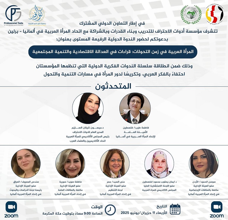 تم عقد ندوة المرأة العربية في زمن التحولات: قراءات في العدالة الاقتصادية والتنمية المجتمعية مساء أمس الأربعاء 11 / يونيو 2025عبر منصة زوم. بحضور أكثر من 97 سيدة حول العالم. ويأتي عقد هذه الندوة ضمن انطلاقة سلسلة الندوات الفكرية الدولية التي تنظمها المؤسستان، احتفاءً بالفكر العربي النسوي، وتكريسًا لدور المرأة في مسارات التنمية والتحول.