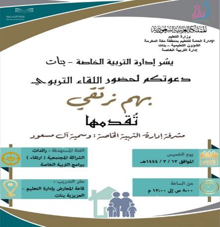 أقامت إدارة التربية الخاصة بالإدارة العامة للتعليم بمنطقة مكة المكرمة اللقاء الأول لرائدات وحدة شراكة المدرسة مع الأسرة و المجتمع ( ارتقاء ) بعنوان (نرتقي بهم ) يوم الخميس 12/2/1444هـ ، بإدارة التعليم بنات العزيزية / قاعة المعارض نفذهُ مشرفة التربية الخاصة وسمية عبدالعزيز المسعود ومساندة رائدات وحدة ارتقاء ببرامج التربية الخاصة.