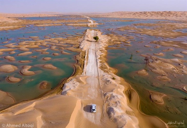 وأظهرت الصور التي التقطها المصور العماني أحمد الطوقي، كيف حولت مياه الأمطار أجزاء كبيرة من الصحراء والأرض القاحلة إلى لوحات فنية بديعة