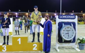 توج سمو الأمير عبد الله بن فهد بن عبد الله آل سعود رئيس الاتحاد السعودية للفروسية، الفارس الألماني فيليب فايسهاوبت بالمركز الأول في شوط الاتحاد الدولي للفروسية “FEI” المؤهل لنهائيات كأس العالم لقفز الحواجز 2022 في ألمانيا، لفئة الـ (5 نجوم ـ ارتفاع 1.50 متر) ضمن بطولة “قفز السعودية “في أسبوعها الثاني والأخير والتي ينظمها الاتحاد السعودي للفروسية، وتحت اشراف الاتحاد الدولي للفروسية “FEI” في مقر “قفز السعودية” على أرض ميدان نادي سباقات الخيل في الجنادرية.