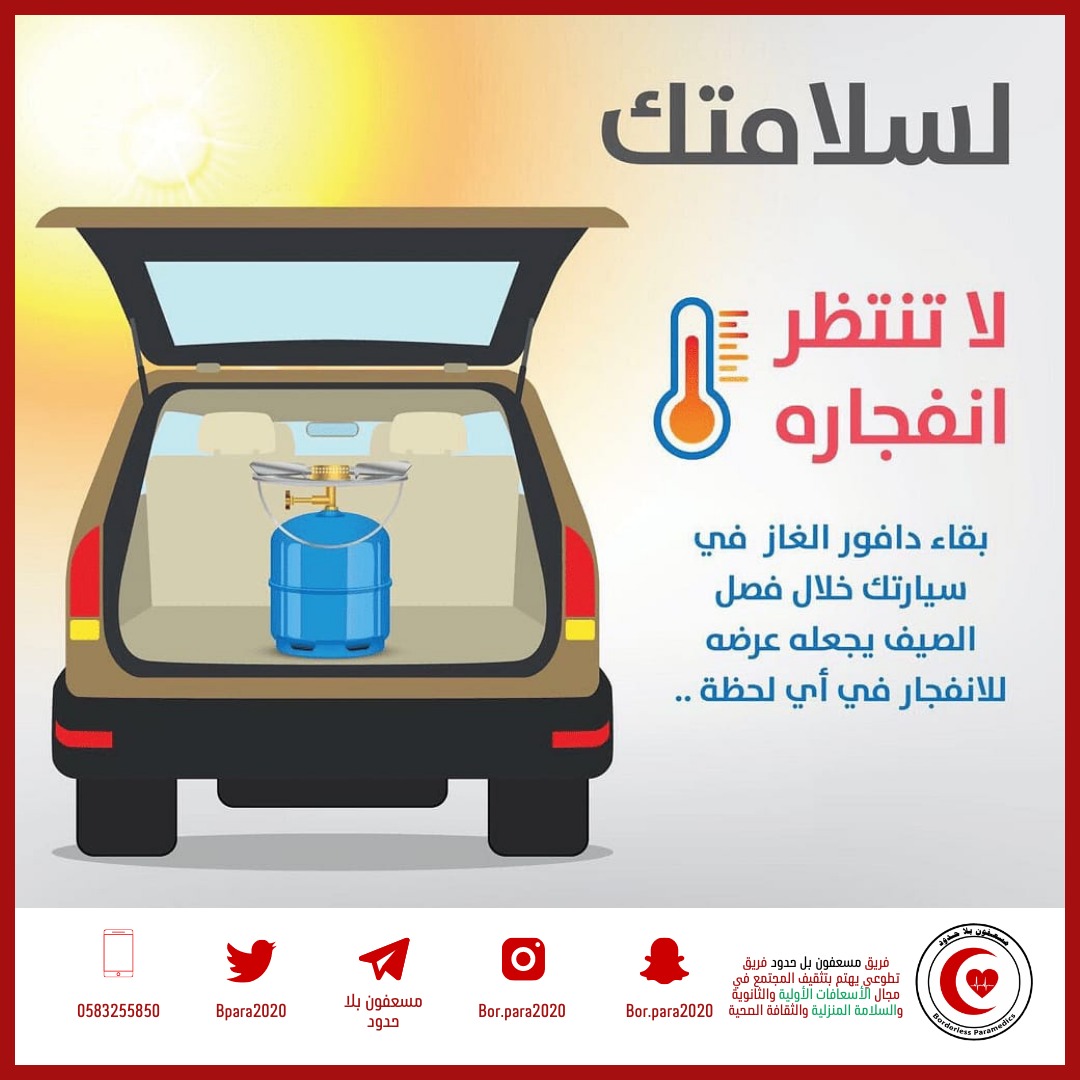 حذر مشرف شؤون السلامة بفريق “مسعفون بلا حدود” التطوعي علي منصور الطويل، من إبقاء دافور الغاز داخل السيارة خلال فصل الصيف،أثناء الرحلات الطويلة، مما يجعلها عرضه للإنفجار في أي لحظة، خاصة إذا كانت السيارة محكمة الغلق والتهوية.