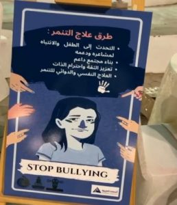 أو نشر الشائعات أو غيرها من الأمور. كما تم التحدث عن طرق مواجهة الأطفال وزيادة وعي الأطفال وذويهم عن هذه الظاهرة ،وتم توزيع العديد من الهدايا الرمزية للزوار .