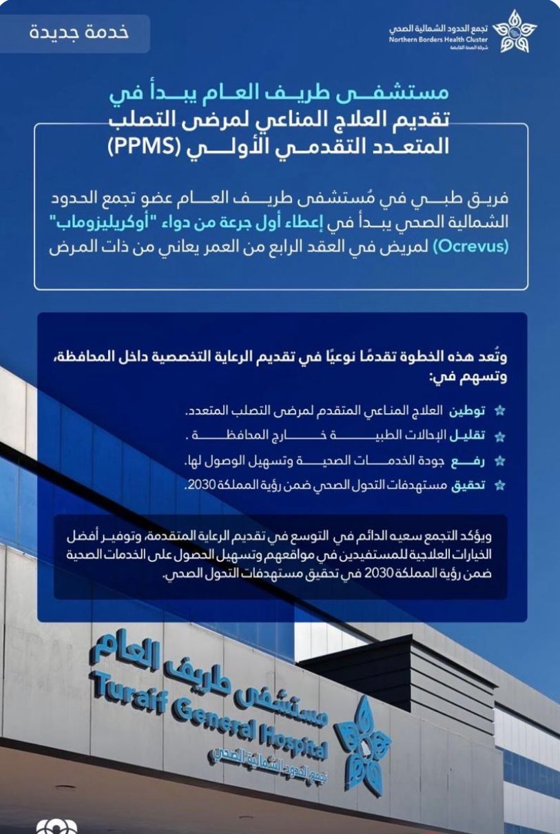 مستشفى طريف العام يبدأ تقديم العلاج المناعي لمرضى التصلب المتعدد التقدمي الأولي