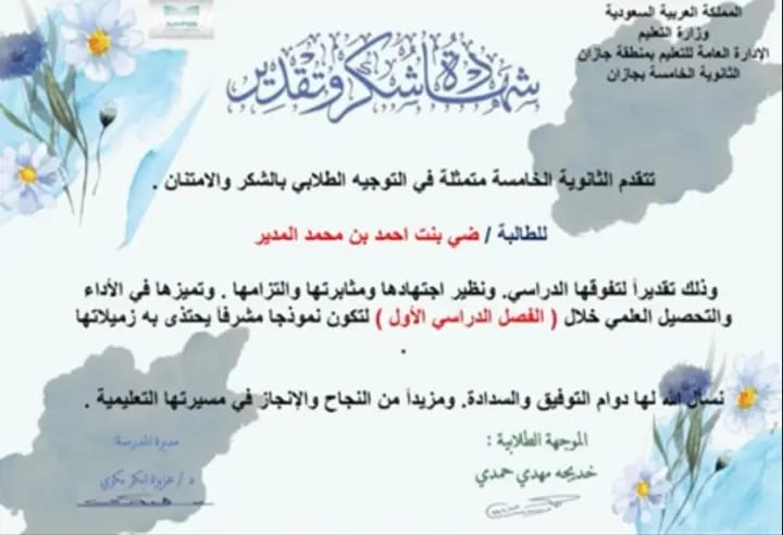 كما يرفع د.احمد المدير ولي امر الطالبة ضي المدير أسمى عبارات الشكر والتقدير لإدارة الثانوية الخامسة، بقيادة قائدتها الفاضلة،خديجة مهدي حمدي وقسم التوجيه والإرشاد، على جهودهن الملموسة في رعاية بناتنا وتعزيز دافعهم نحو التميز.