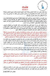 وأفادت النقابة بأنها اجتمعت مع المدير العام ل(كونا) فاطمة السالم بتاريخ 04/05/2023 وتمت الموافقة على المطالبات المقدمة بتاريخ 26/03/2023 كما تم الاتفاق على عقد اجتماع شهري لمناقشة ومتابعة مطالبكم ومشاكلكم، محذرين الإدارة من عدم الاستمرار باستفزاز العمال عن طريق المماطلة واهمال مطالبهم المستحقة والا سنمضي على ما اقدمنا عليه باتخاذ الاجراءات والسبل القانونية التصعيدية التي احقها لنا الدستور والقانون.