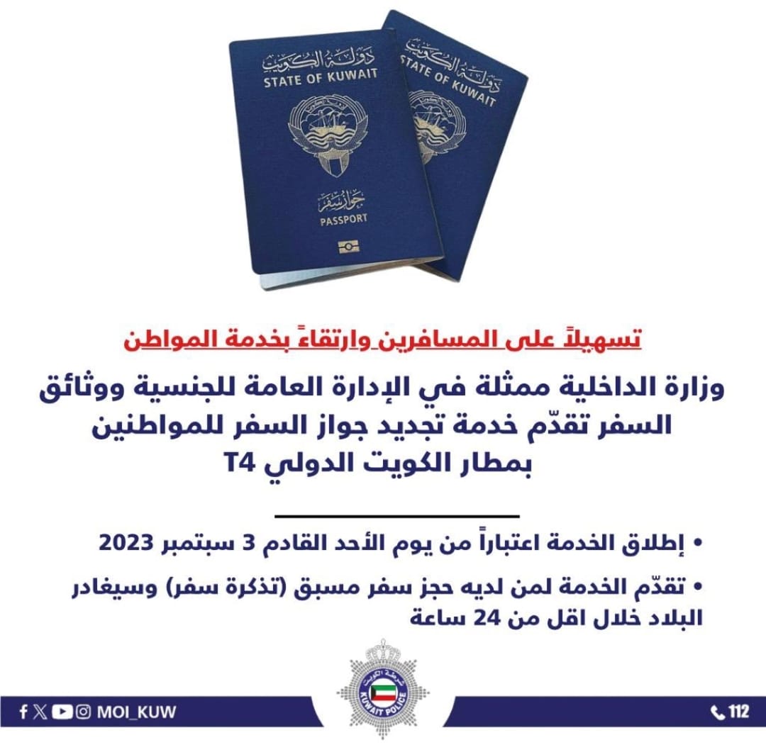 تقوم الإدارة العامة للجنسية ووثائق السفر بتوفير خدمة طباعة تجديد جواز السفر للمواطنين بمطار الكويت الدولي T4 وذلك انطلاقاً من يوم الأحد القادم 3 سبتمبر 2023 لمن لديهم حجز سفر مسبق وسيغادر البلاد خلال أقل من 24 ساعة.