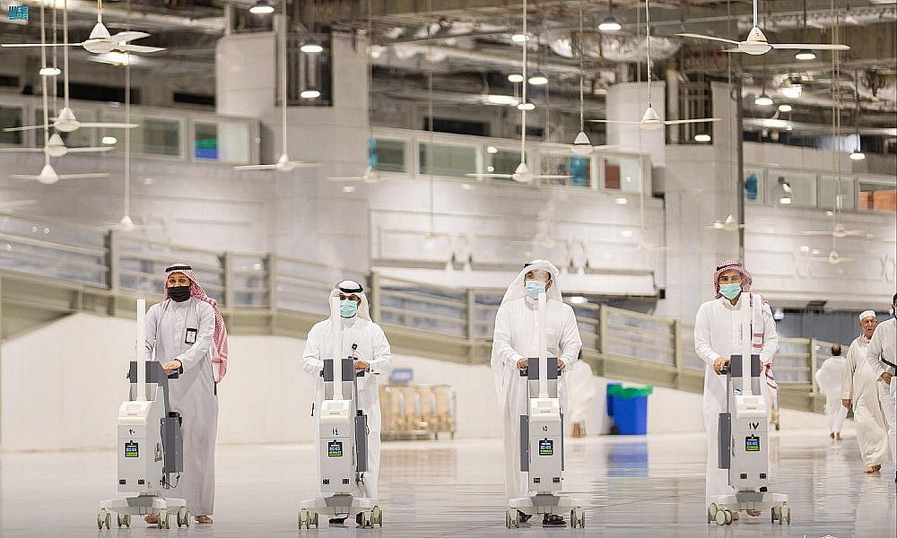 وتعمل “الروبوتات” على تعقيم وتغطية كل جنبات المسجد الحرام، بنظام تحكم آلي مبرمج على خريطة مسبقة، وعلى (٦) مستويات؛ ما يحسّن سلامة الجو الصحي البيئي وتحليل متطلبات التعقيم بذكاء، وفقاً لـ”سيناريوهات” الاستخدام، ومسار التعقيم، والمدة المخططة بشكلٍ مستقل لتغطية كاملة للفضاء البيئي.