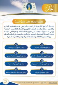 مؤكداً أن حصول ثمانية برامج أكاديمية على الاعتماد البرامجي جاء تتويجًا للجهود التي تقوم بها الجامعة، من خلال أهدافها الاستراتيجية، وسعيها في الارتقاء بجودة وكفاءة العملية التعليمية، وتحسين مخرجاتها، بما يسهم في تحقيق أهداف رؤية السعودية ٢٠٣٠، ومستهدفات برنامج تنمية القدرات البشرية، ويأتي ذلك امتدادًا للمنجزات التي حققتها الجامعة على المستويين الدولي والمحلي.